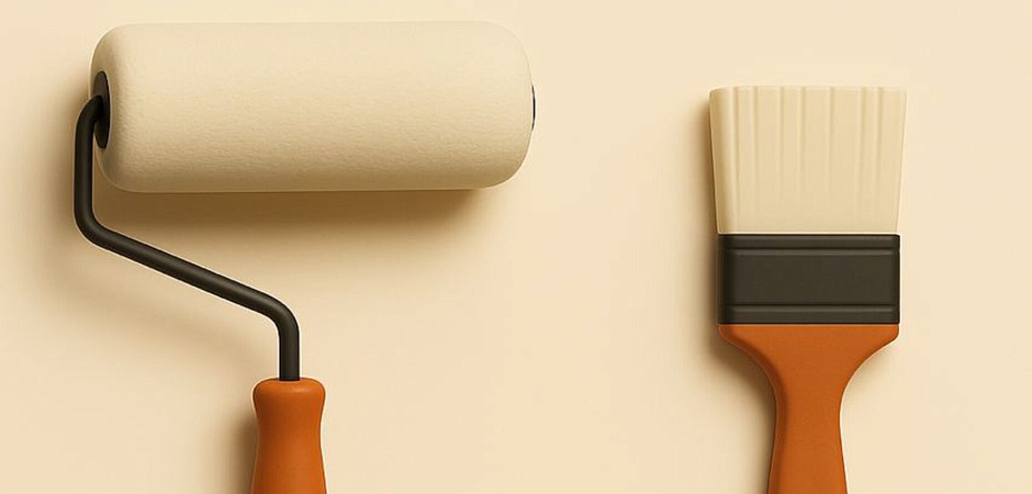- Понадобятся: валик с длинным ворсом, кисть для углов, малярный лоток и телескопическая ручка для валика.